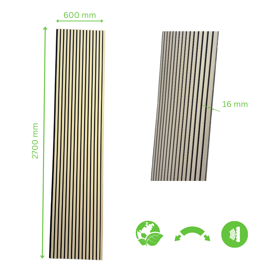 - Die Paneele reduziert störende Nachhallzeiten und verbessert die Raumakustik durch ihre speziellen Lamellenstrukturen und die schallabsorbierende Rückseite.